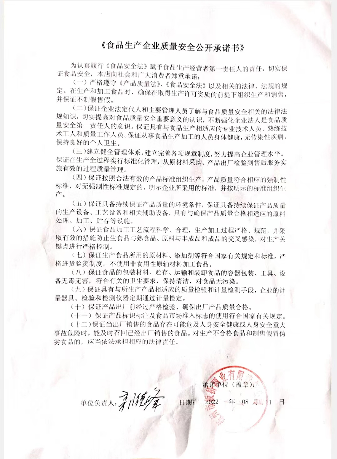 食品生产企业质量安全公开承诺书